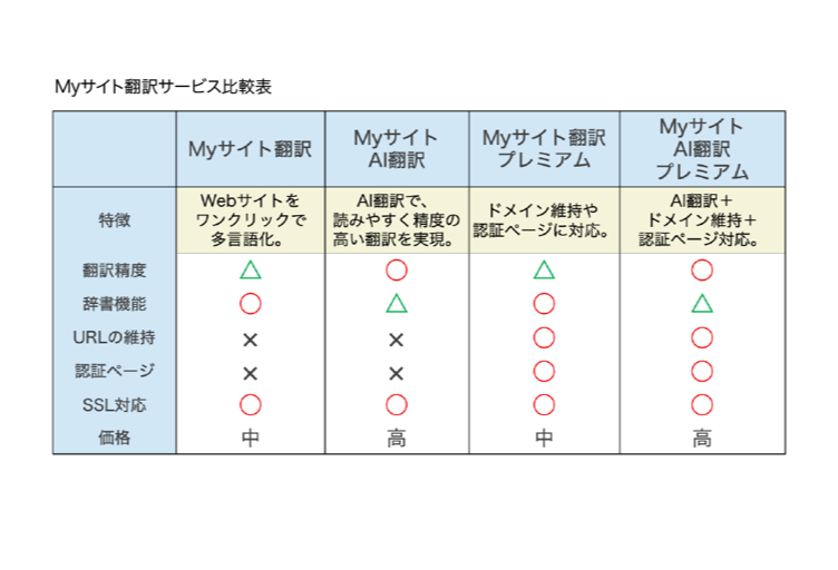 | 技術紹介 | 翻訳精度の高い「AI翻訳」、越境ECなど、ドメイン維持が可能で認証ページに対応した「プレミアム」など、ご利用目的や環境に合わせて4種類のサービスから選択できます。更に、画像入れ替えや地図ページの対応などの無料オプションに加え、画像加工・登録や訳質チェックなどの有料オプションも豊富にご用意しています。サイト情報量が多く、更新頻度が高いサイト、サイト情報に即時性を求められるサイトに特におすすめです。 | |