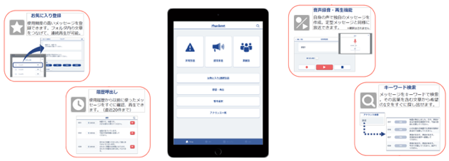 | 技術紹介 | 主な機能としては使用頻度の高いメッセージを登録し、複数のメッセージをつなげて連続再生することができます。→「お気に入り登録」、今、呼びかけたいアナウンスをご自身の声で録音し、そのまま再生することができます。但し自動翻訳はできません。→「音声録音・再生」、メッセージの中からご希望の文字列を含むメッセージを探し出すことができます。→「キーワード検索」などがあります。 | |