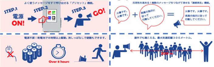 | 技術紹介 | 標準搭載の606メッセージは外国人観光客が正しくに認識できるよう、全てネイティブによるアナウンスにて収録されています。直感的に操作してできるよう、アイコン選択方式を採用しています。汎用的なメッセージをつなげて連続再生をすることで効果的な案内放送ができます。Wi-Fi、電話回線などを使用しないため災害時にライフラインが遮断された場合でも避難誘導放送を行うことができます。 | |