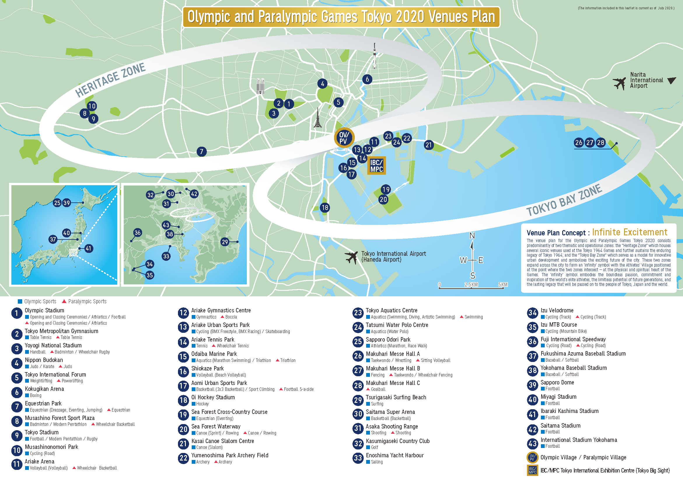 The Venue Plan for the Olympic and Paralympic Games Tokyo 2020 consists predominantly of two thematic and operational zones: the "Heritage Zone" which houses several iconic venues used at the Tokyo 1964 Games and further sustains the enduring legacy of Tokyo 1964; and the "Tokyo Bay Zone" which serves as a model for innovative urban development and symbolises the exciting future of the city. These two zones expand across the city to form an ‘infinity’ symbol with the Athletes' Village positioned at the point where the two zones intersect – at the physical and spiritual heart of the Games. The ‘infinity’ symbol embodies the boundless passion, commitment and inspiration of the world's elite athletes, the limitless potential of future generations, and the lasting legacy that will be passed on to the people of Tokyo, Japan and the world.