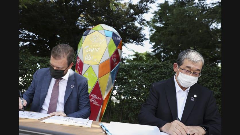 お披露目にあたり、大槌町 平野公三町長は「被災地岩手県から世界へ支援への感謝の気持ちや応援メッセージを届け、アスリートからサインを頂いた復興のモニュメントは世界広しといえど、ここ大槌にしかない唯一無二の存在です。東京2020大会のレガシーとして、町民に限らず多くの皆様に触れて頂き、しっかりと継承してまいりたいと思います。」とご挨拶しました。