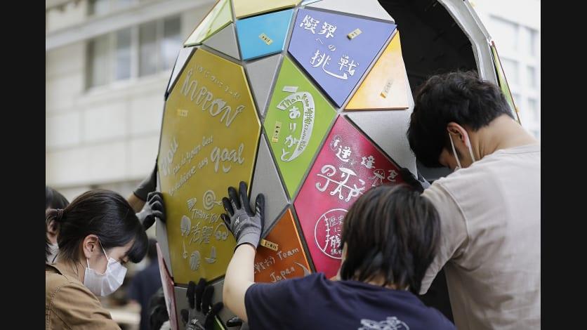 2021年7月13日、大会期間中の設置場所であるオリンピックスタジアム(国立競技場)近くの聖徳記念絵画館前で東京2020 復興のモニュメントをお披露目しました。モニュメントは大会期間を通じて展示し、世界から集まった多くのアスリートにメッセージを届けます。大会終了後は、アスリート等のサインをモニュメントに加工し、被災地に届けます。