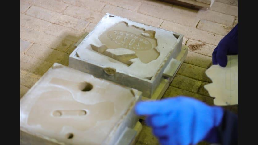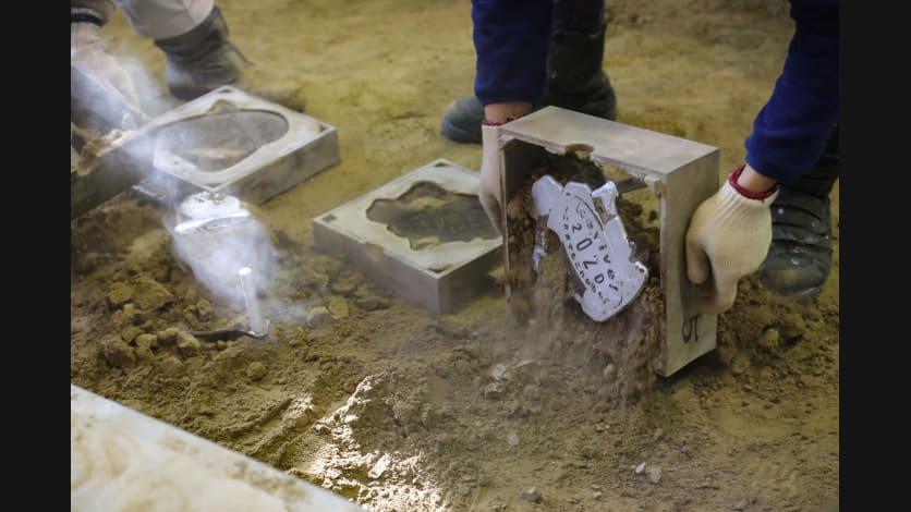 次に、メッセージを木型におこし、それを鋳物砂で型を取って鋳型を作ります。鋳型作りは、一つ一つを手作業で、時間をかけて行います。