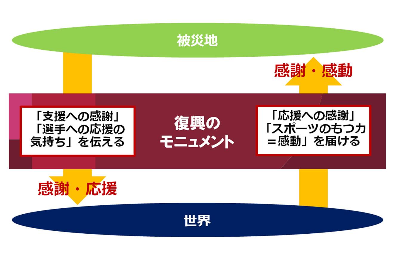 東京2020 復興のモニュメントは、被災地から世界へ、震災以降の支援に対する感謝の気持ちや、大会に出場するアスリートへの応援のメッセージを届けるとともに、世界から被災地へ、応援への感謝やスポーツのもつ力、感動を被災地へ届けることにより、被災地を元気づけるという、モニュメントを通した双方向のコミュニケーションを図ることをコンセプトとした事業です。