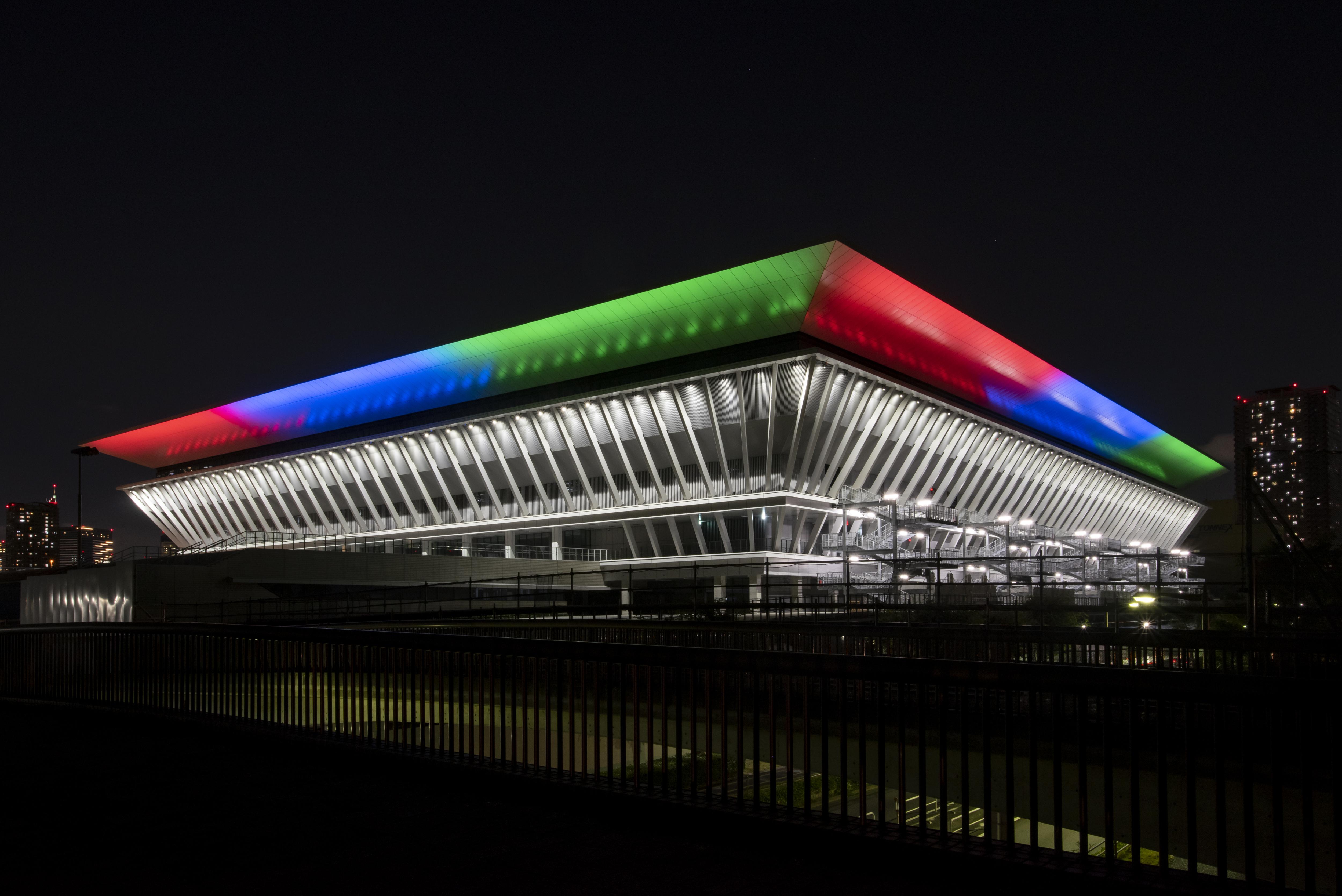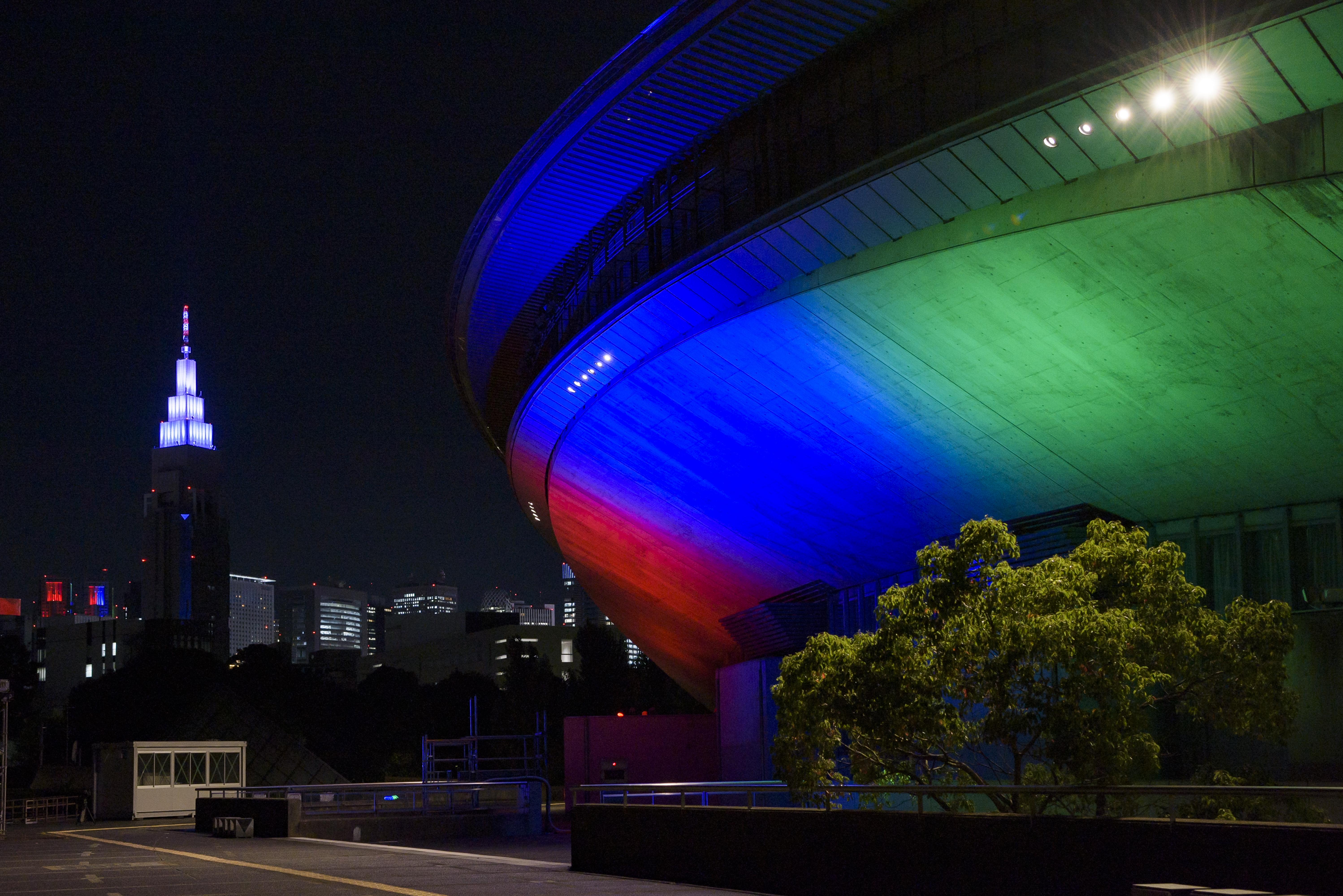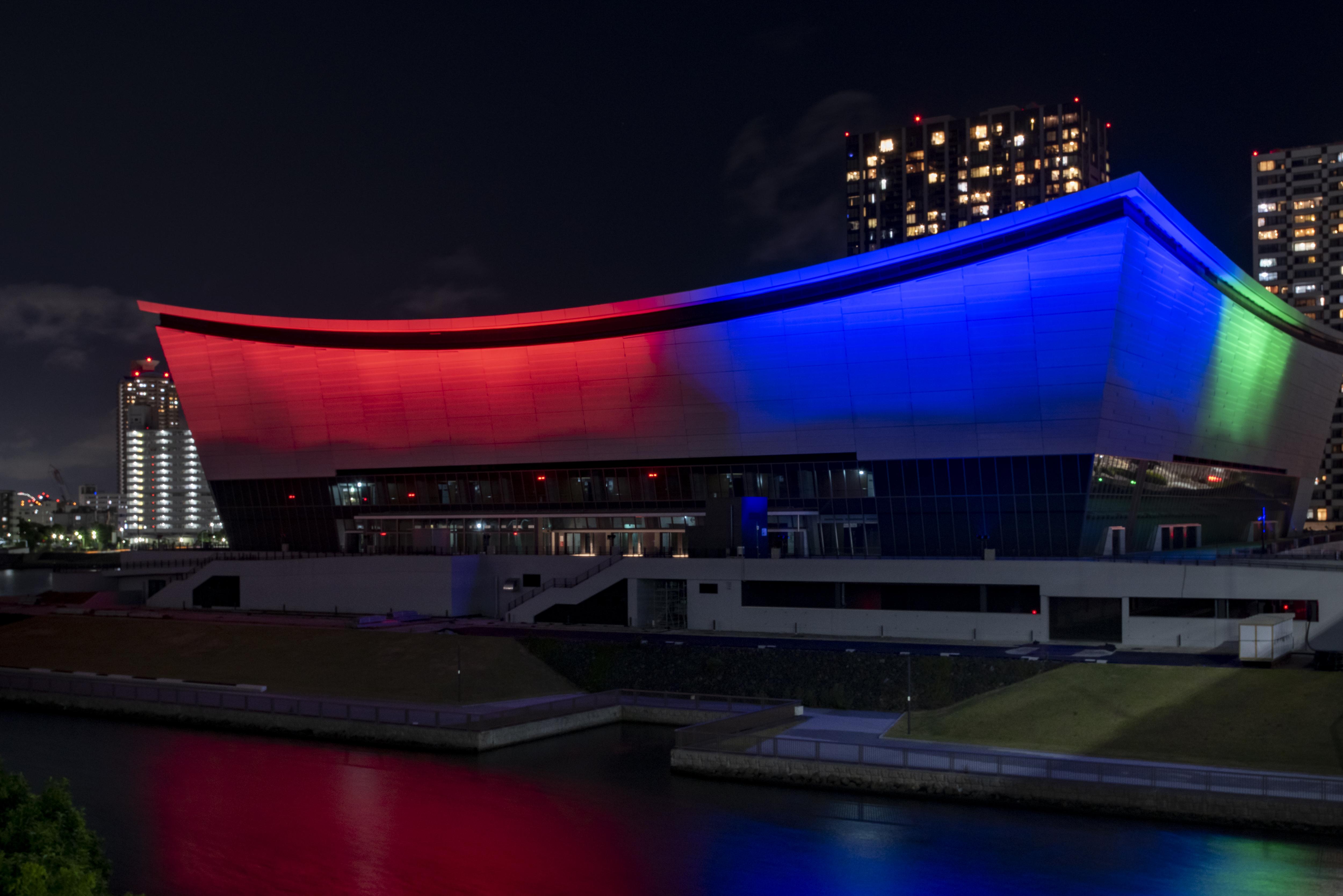 東京都では、東京2020パラリンピック1年前の節目に、新型コロナウイルス感染症の治療に尽力する医療従事者等への感謝の気持ちを示すとともに、大会に向けて準備を進めるアスリートへの応援の思いを込めて、大会の象徴となる都立競技施設を中心にライトアップを実施しました。(パラリンピックのシンボルマーク「スリーアギトス」に使われている赤・青・緑の3色)<東京アクアティクスセンター>