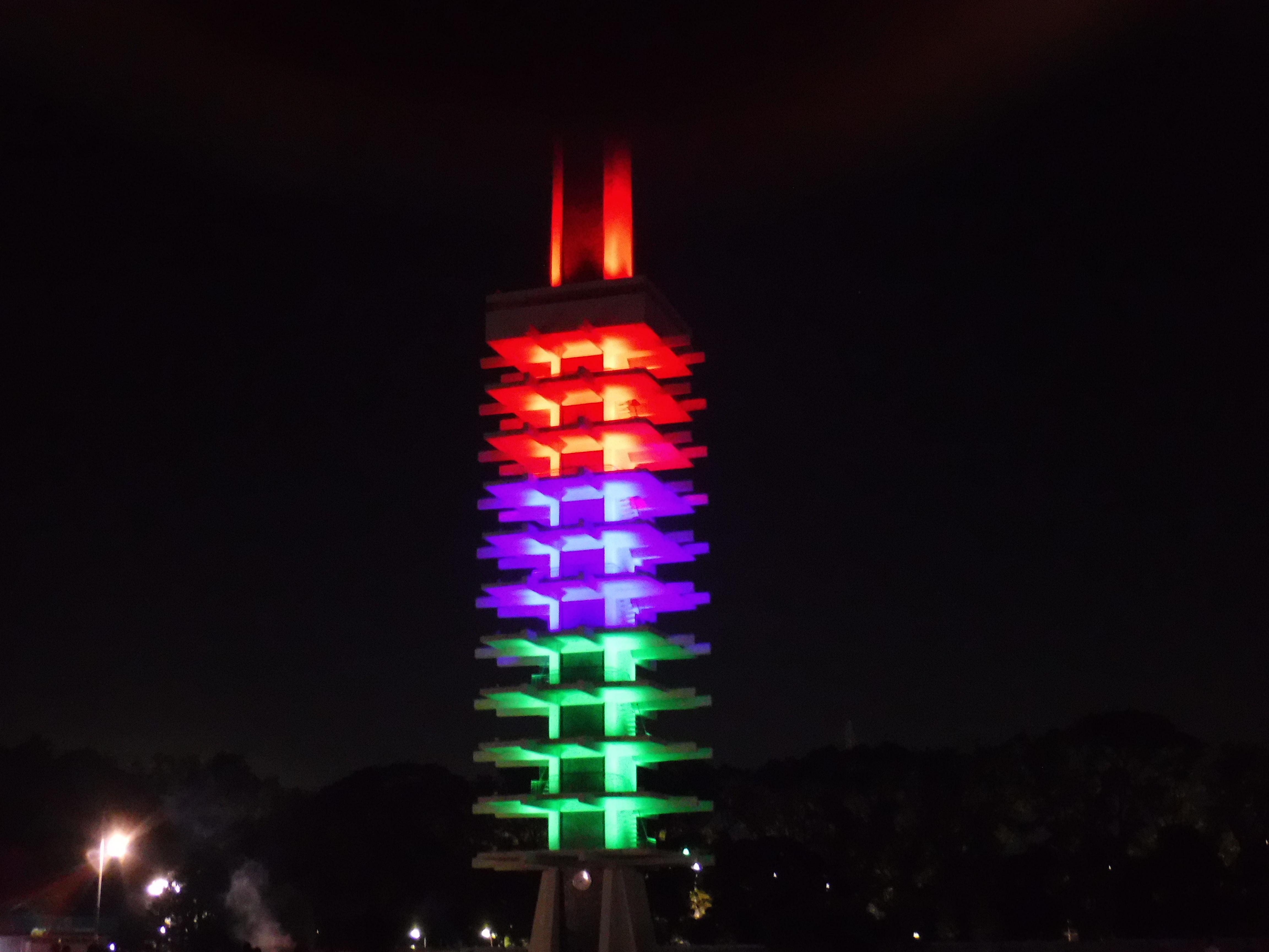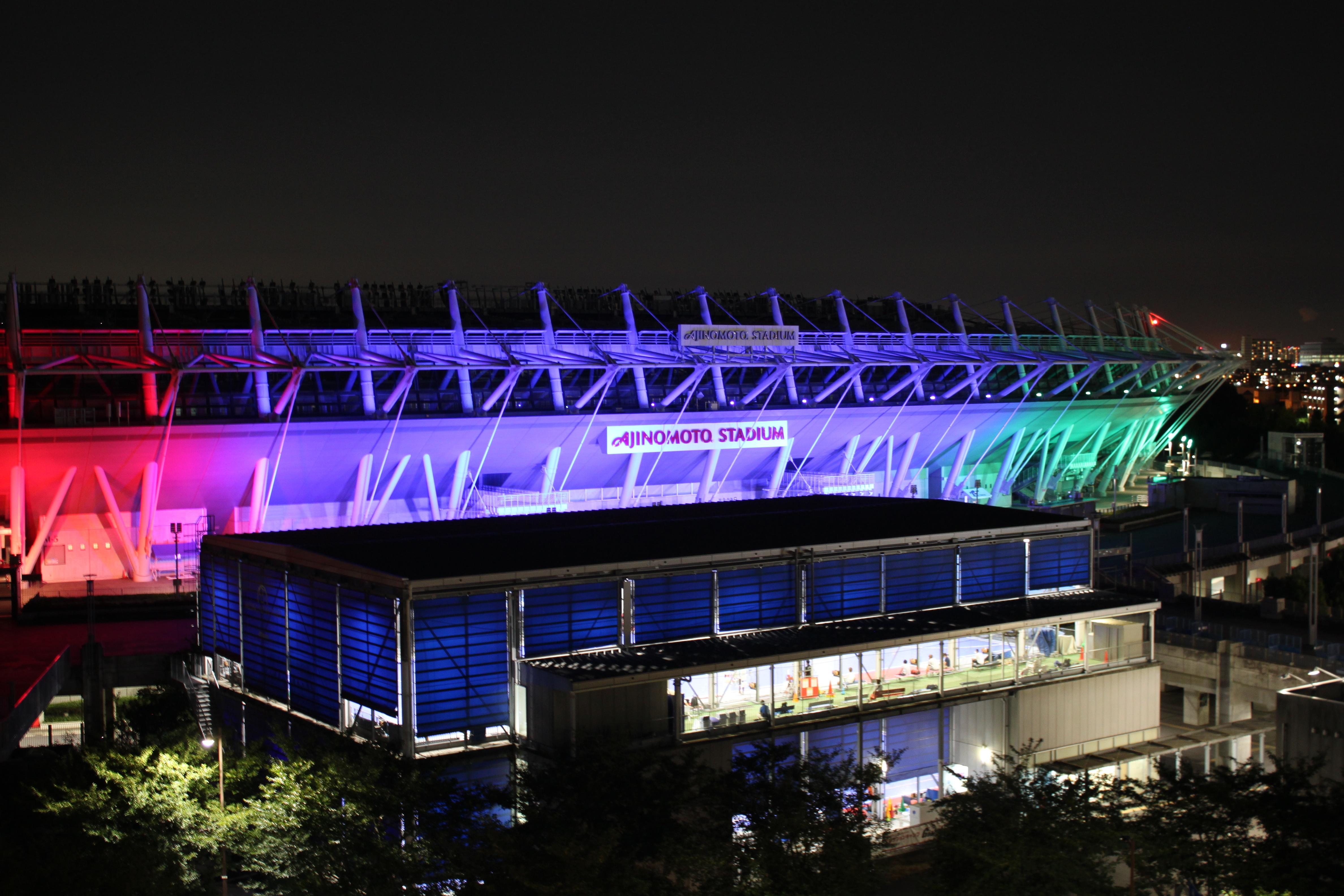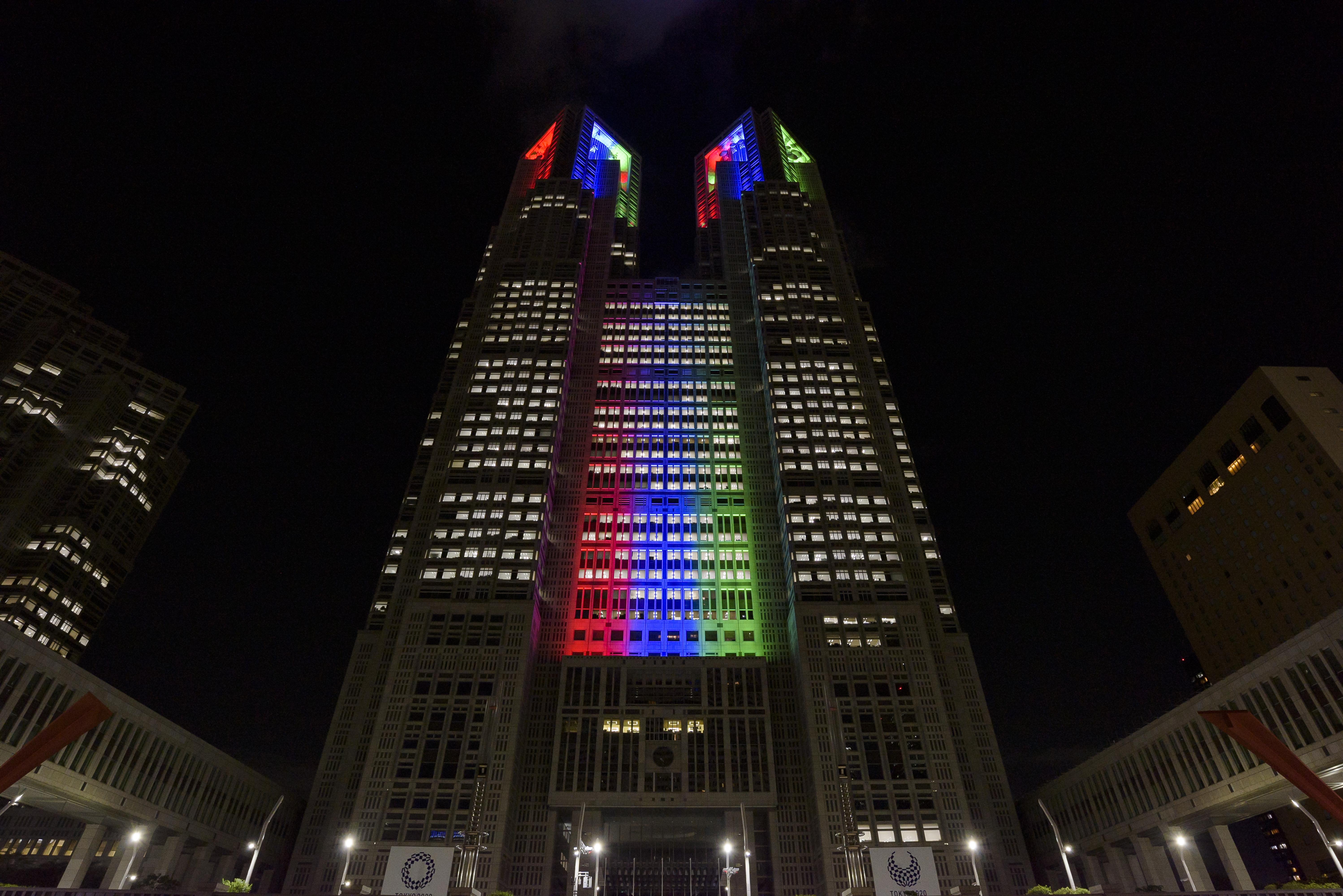 東京都では、東京2020パラリンピック1年前の節目に、新型コロナウイルス感染症の治療に尽力する医療従事者等への感謝の気持ちを示すとともに、大会に向けて準備を進めるアスリートへの応援の思いを込めて、大会の象徴となる都立競技施設を中心にライトアップを実施しました。(パラリンピックのシンボルマーク「スリーアギトス」に使われている赤・青・緑の3色)<東京アクアティクスセンター>