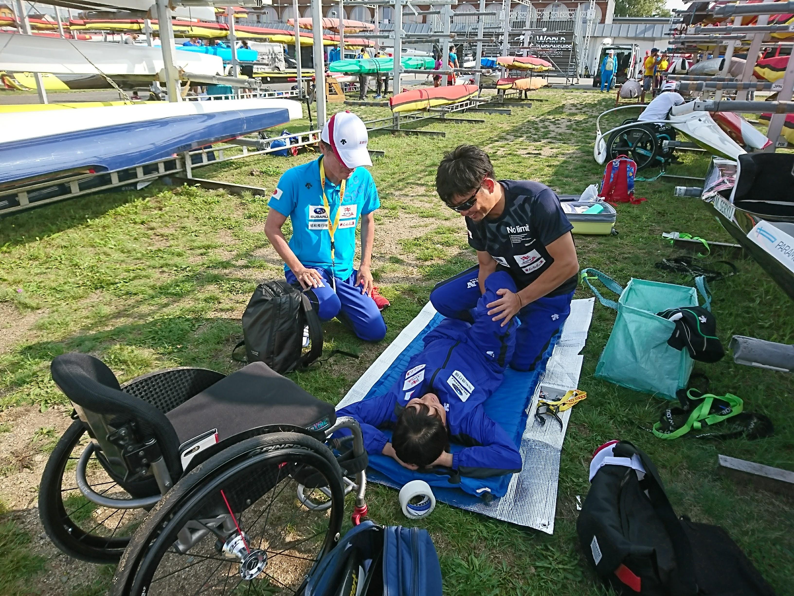 その頃、国内の選手はまだ3、4人しかおらず、パラカヌーはパラリンピックの種目にもなっていなかったので、トレーナーなどの専門職がチームや選手に付いていませんでした。そこで、鳥畑さんからトレーナーとして誘われたのが、僕がパラカヌーに関わるようになったきっかけです。2014年の世界選手権に初めて代表のトレーナーとして連れて行っていただいて以降、2019年まで世界選手権、ワールドカップには常に帯同させていただいています。