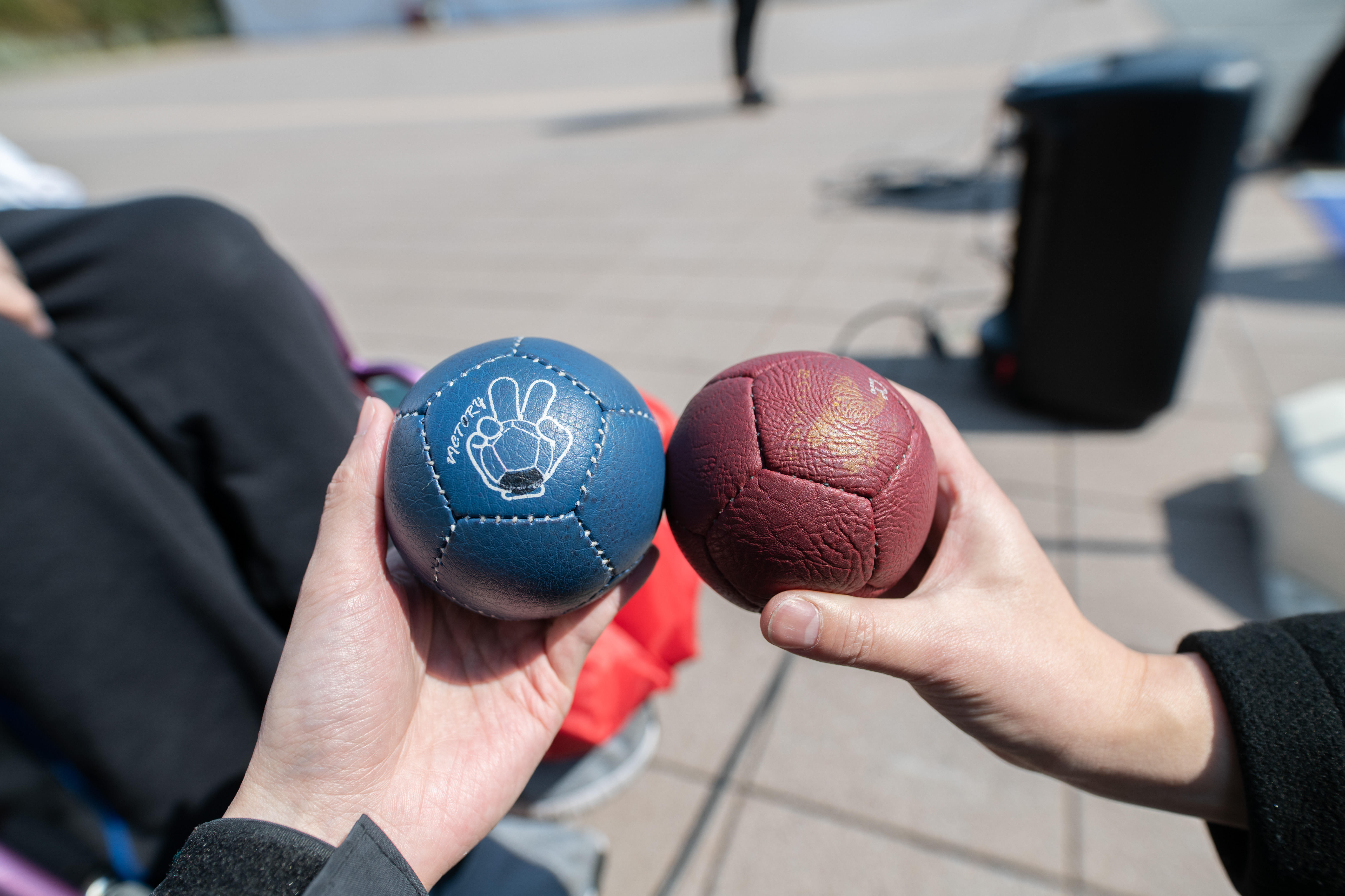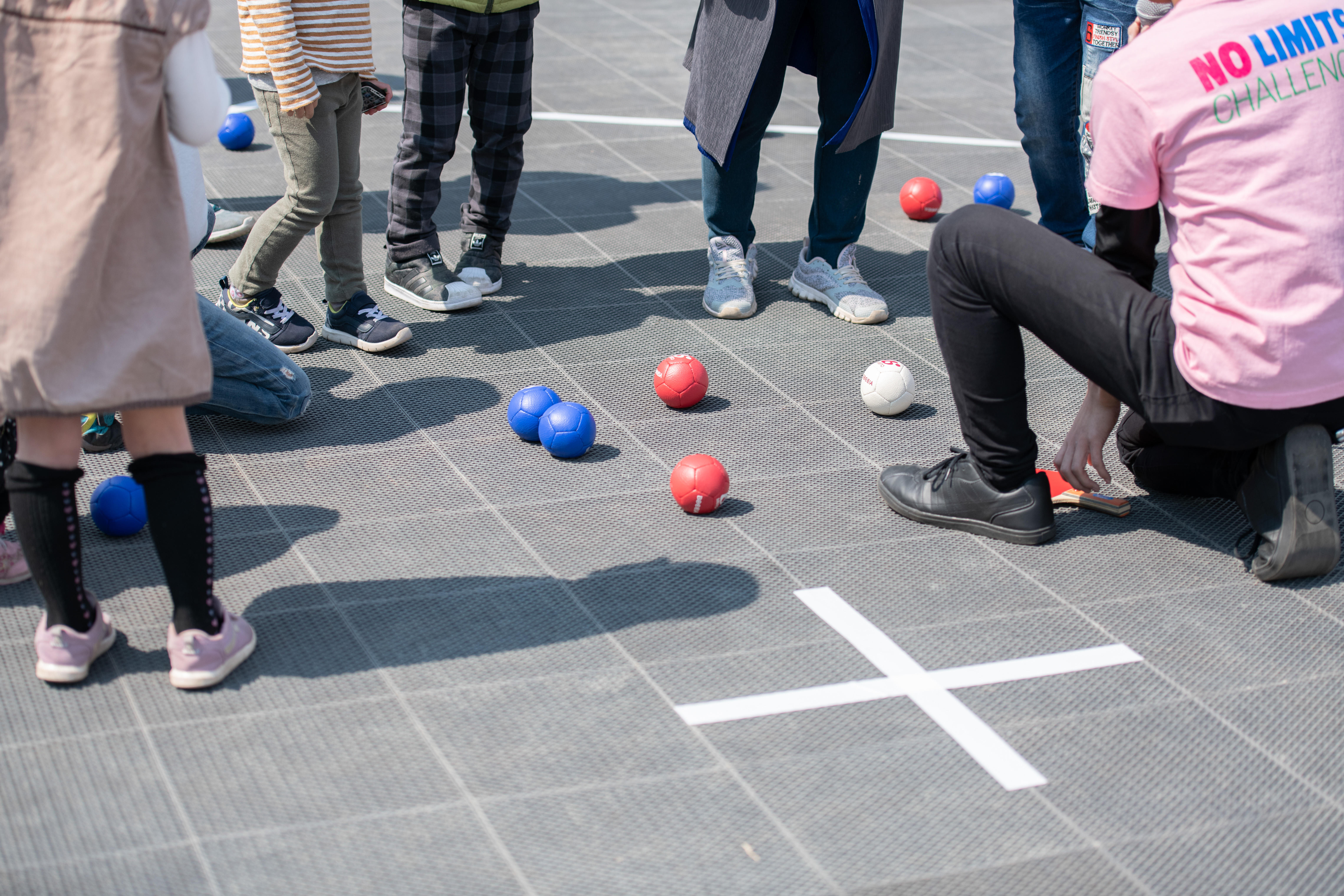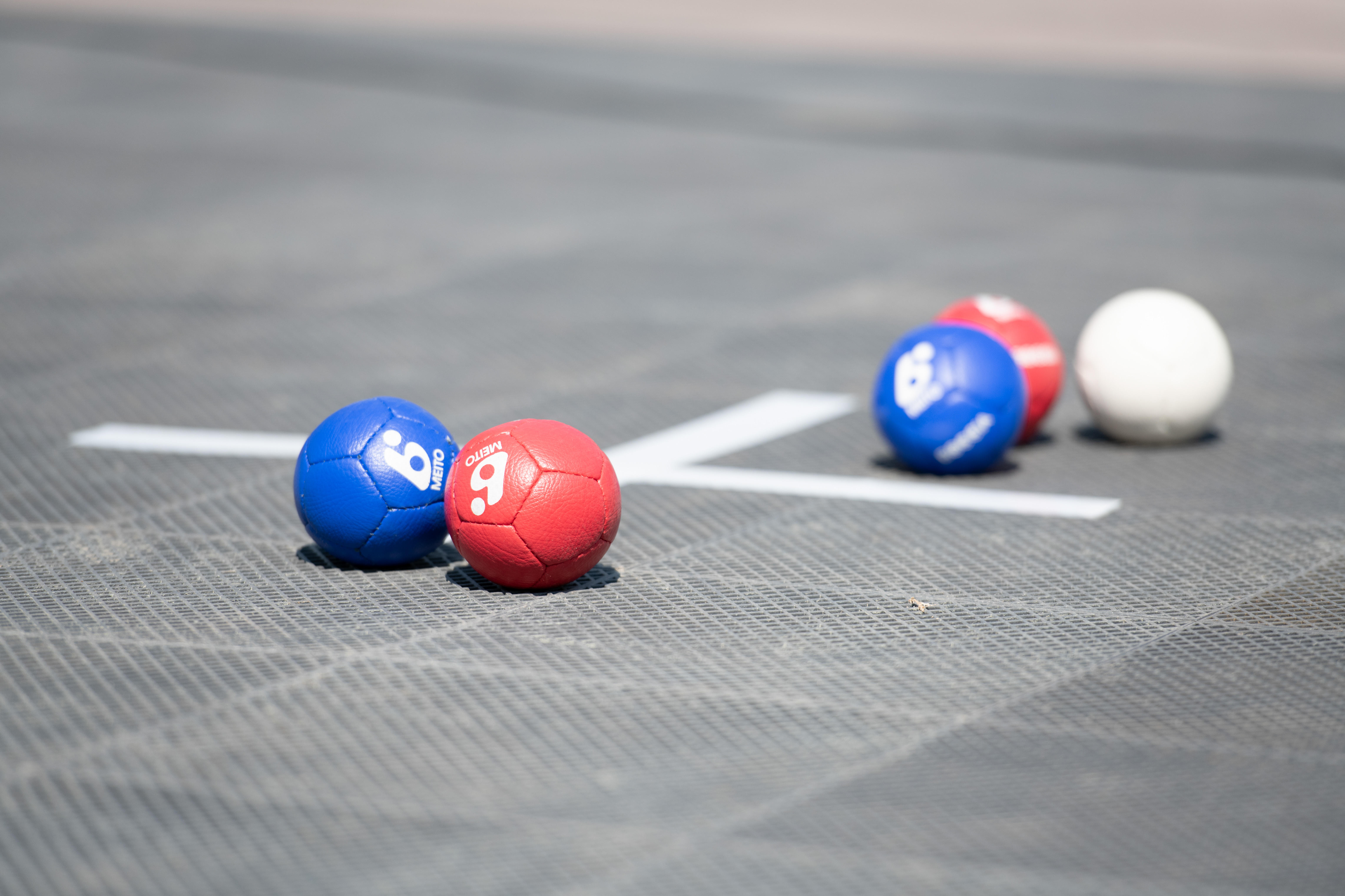 ボッチャは2つのチームの対戦形式で行われます。12.5×6メートルのコートで、「ジャックボール」と呼ばれる白いボールを的に、自分たちのボールを投げたり転がしたりし、より近づけたチームの勝ちというルール。