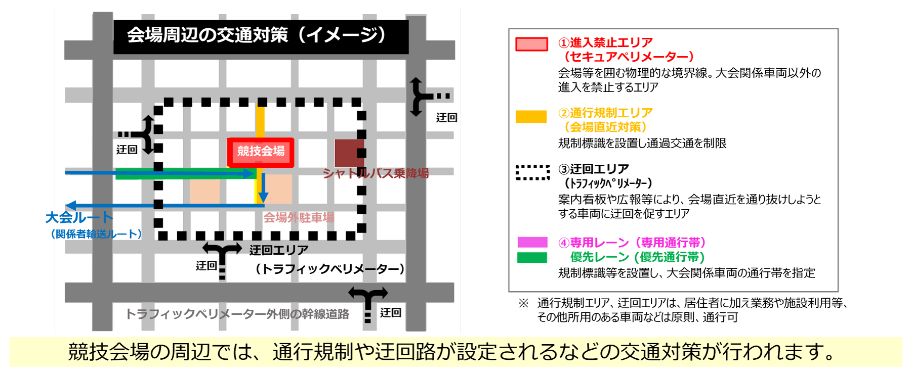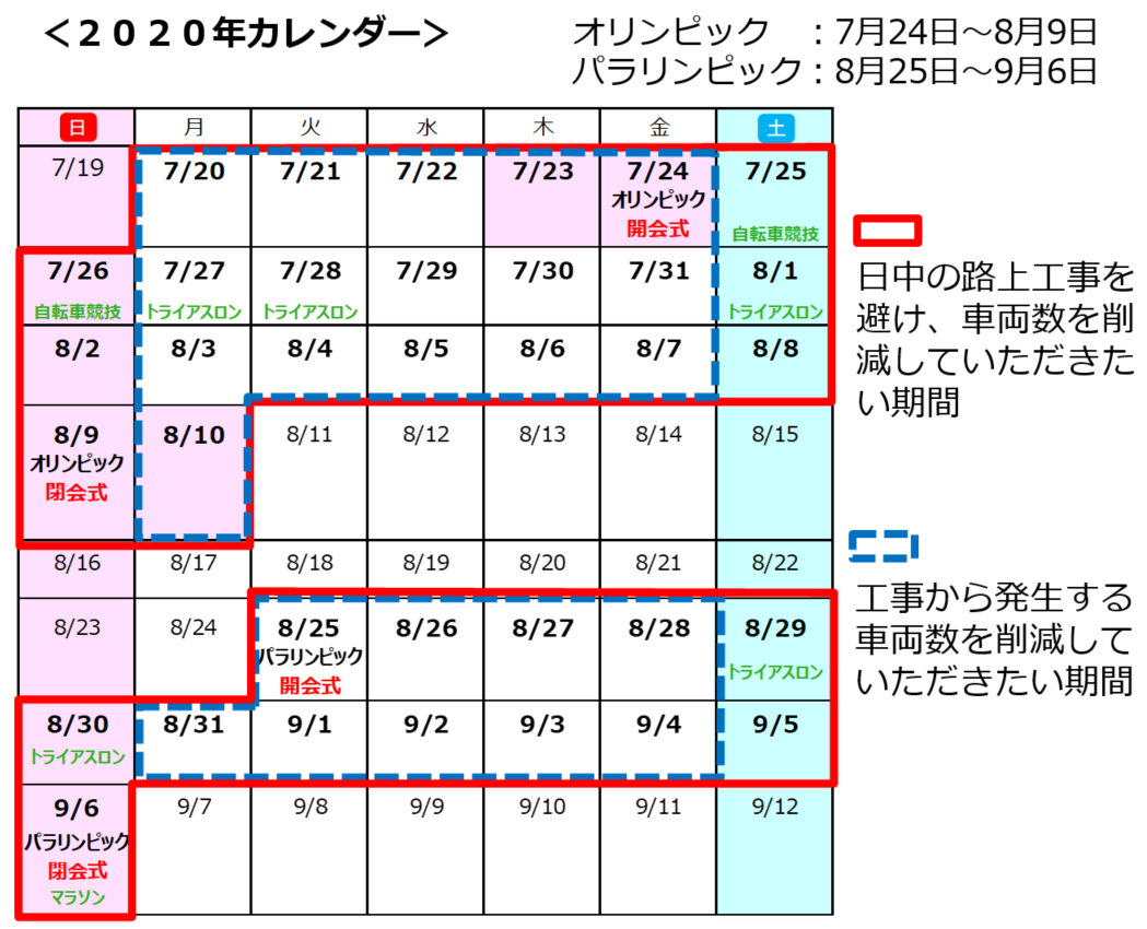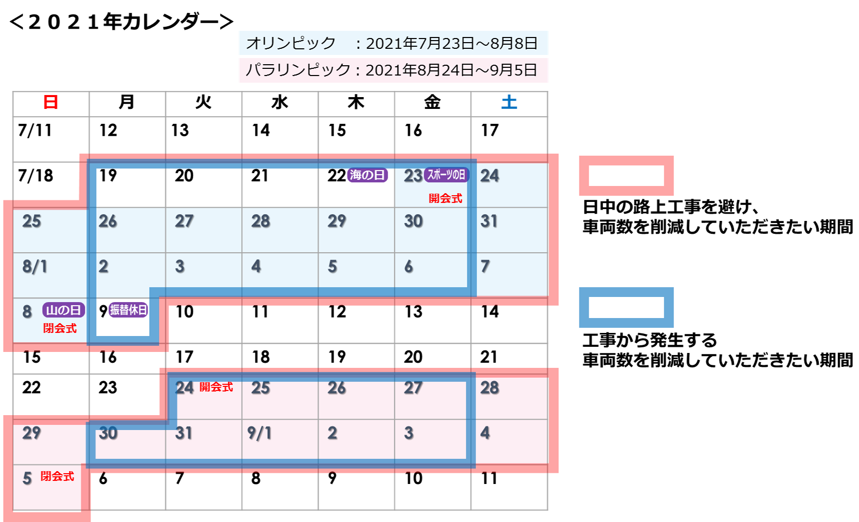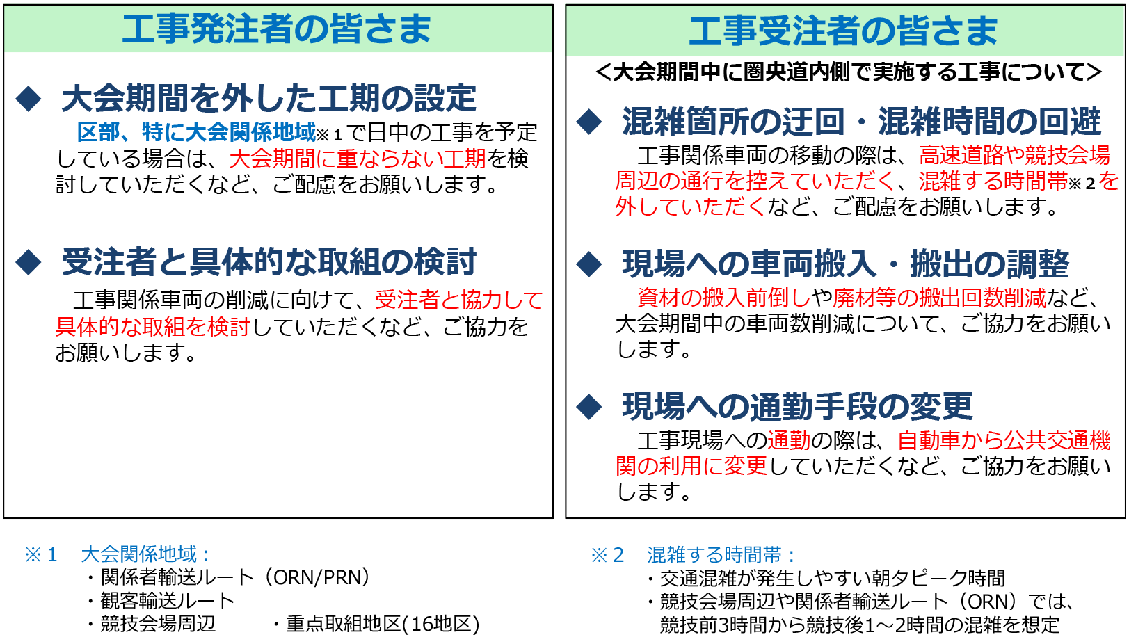 競技会場周辺の道路では、車線規制による混雑を回避するため、昼間は路上工事・作業(道路占用工事等)を控え、夜間も競技日程・時間によって施工時間を調整していただくようご協力をお願いします。
