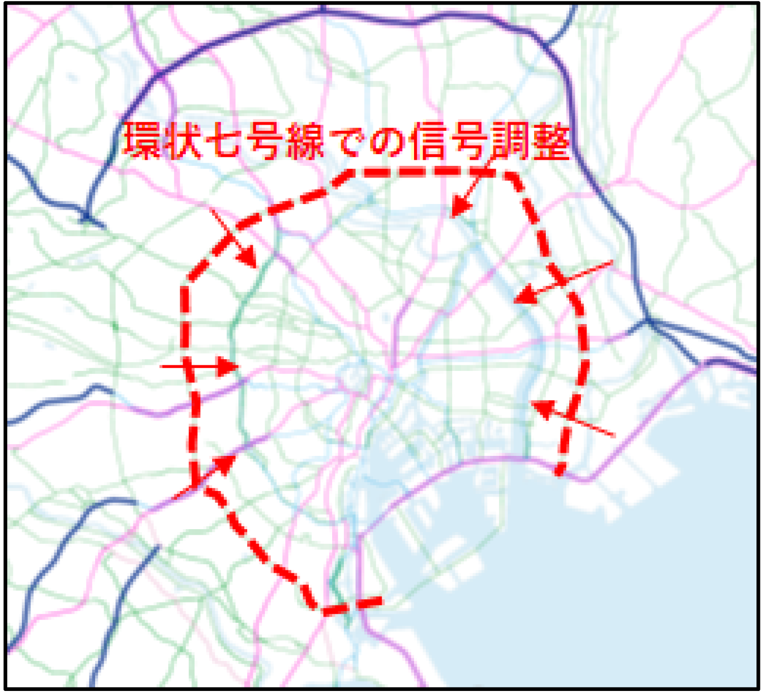 - ⇒ 環状七号線の内側へ直進する交通に対する青信号の時間を通常よりも短くすることで、