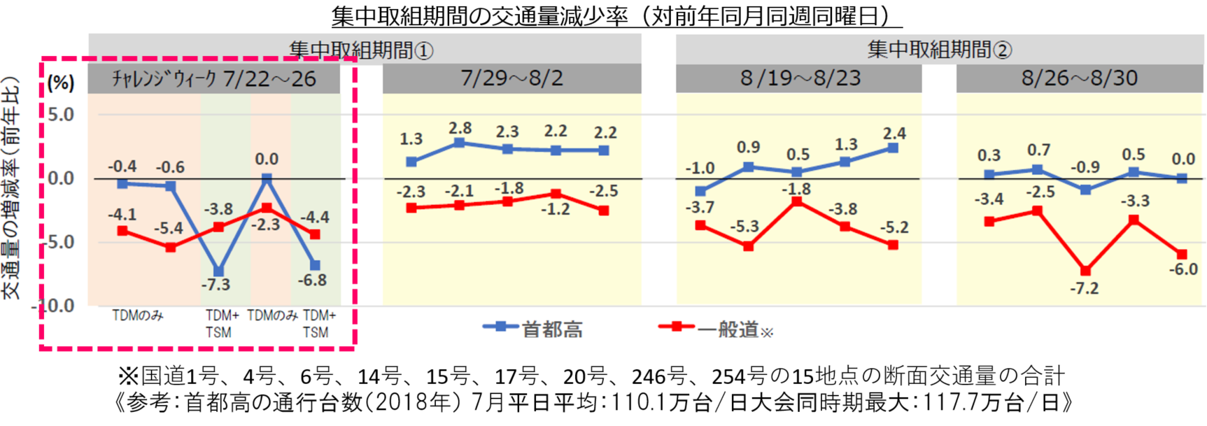 TDM+TSM効果により、首都高約7%減、一般道約4%減 - ■その他の集中取組期間では、首都高は約0.5%~2%増、一般道は約2~4%減
