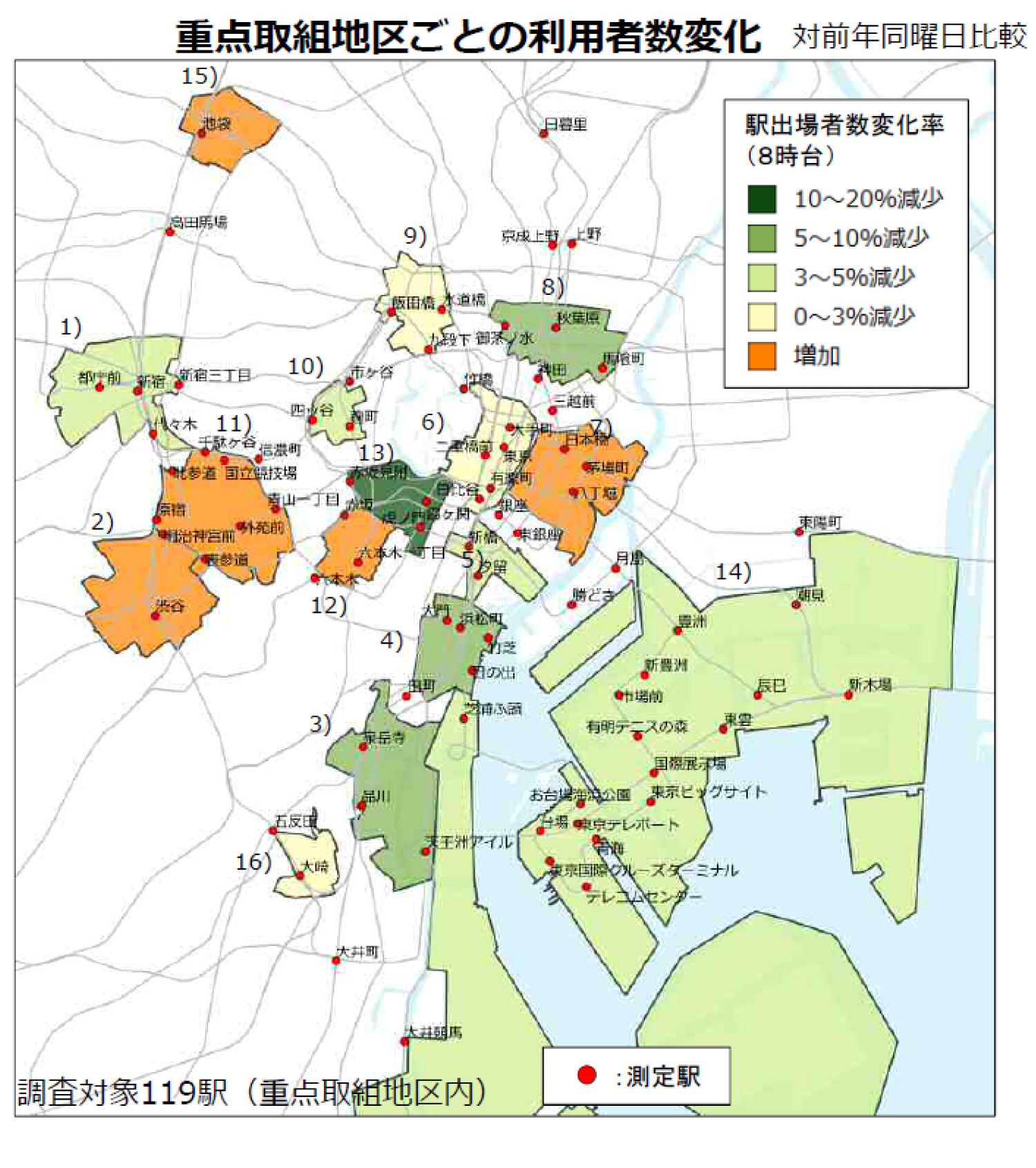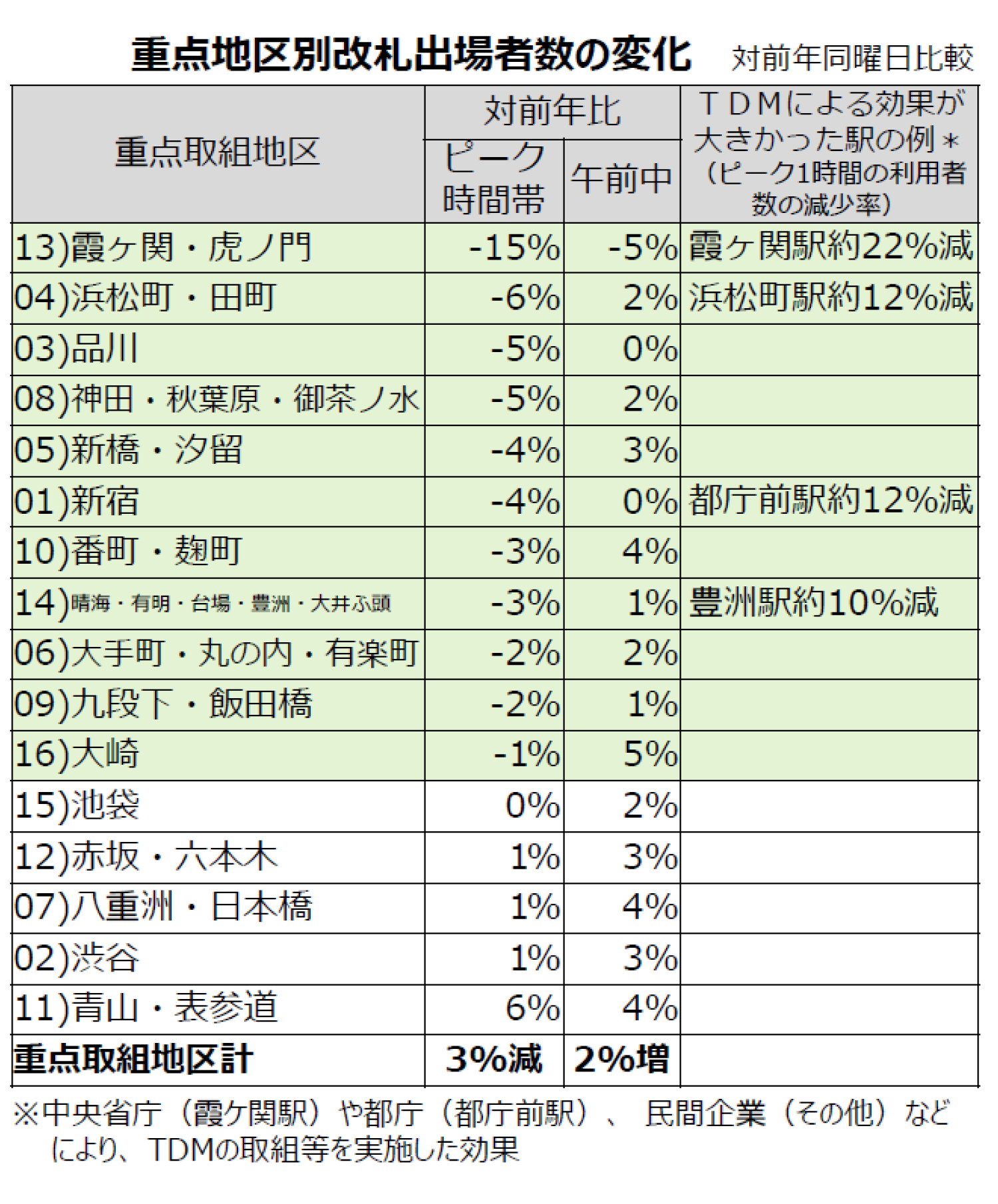 - ■16の重点取組地区の合計で朝ピーク時間帯(8時台)の利用者数が対前年比約3%減少し、その周辺の時間帯に分散
