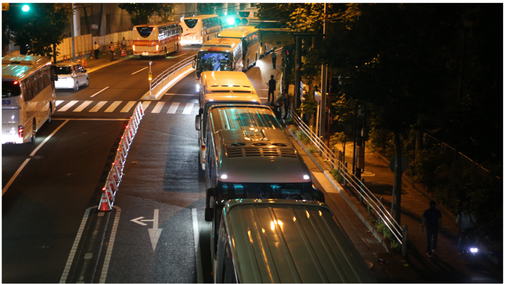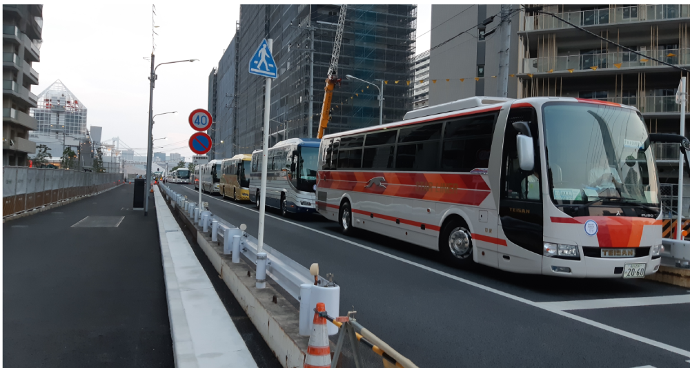 - 実施内容:選手村と新国立競技場との間で、開会式の選手輸送を想定し、会場周辺でのバスの輸送方法の確認や